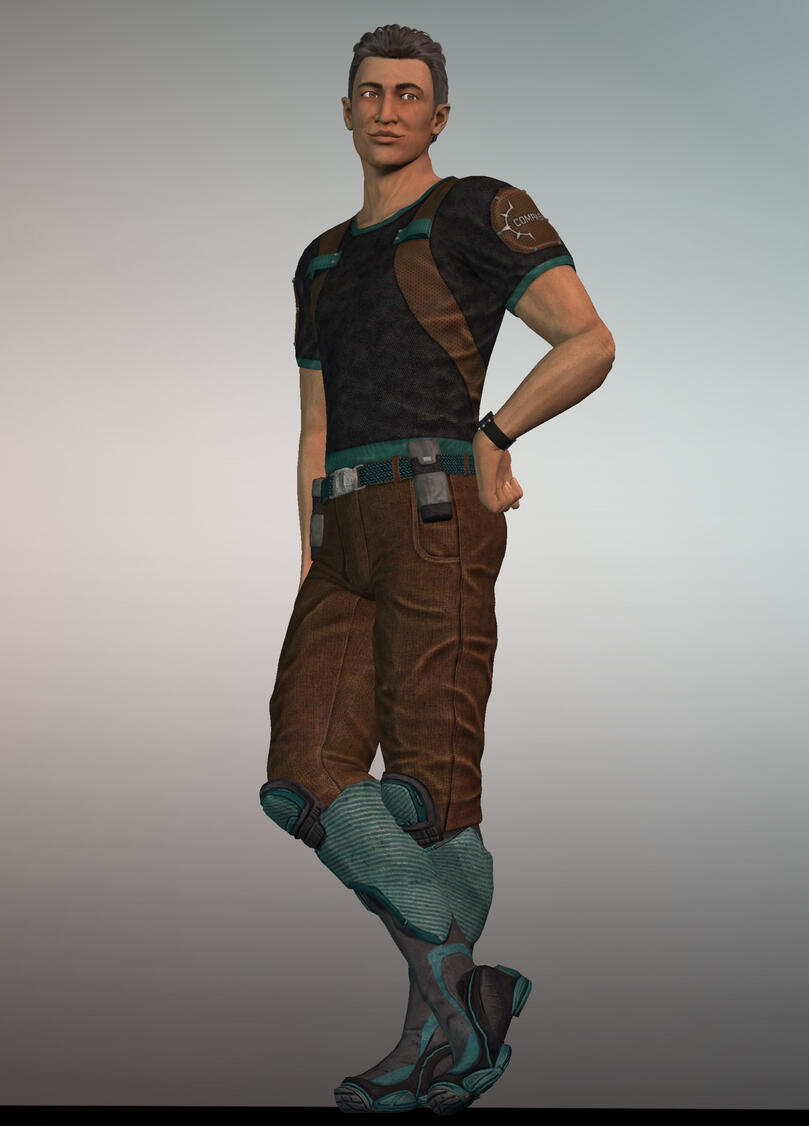 Nadir's design is futuristic without being too outrageous. The boots (a usable asset) are a standout design element, and the shirt is custom-designed with reinforced material that matches the placement of his backpack straps. His pants are loose, comfortable and sturdy, which helps to avoid the skintight design aesthetic that appears often in modern sci-fi styles. He has a limited amount of gear (belt pouches, his watch, and an optional backpack) and practical aesthetic extras, like the flaps on the front of his shirt that hold the backpack straps in place.DESIGN NOTES: Defining Traits